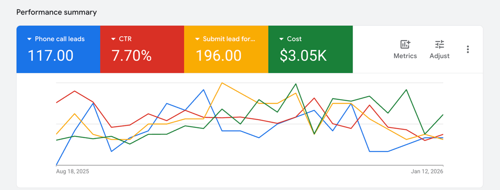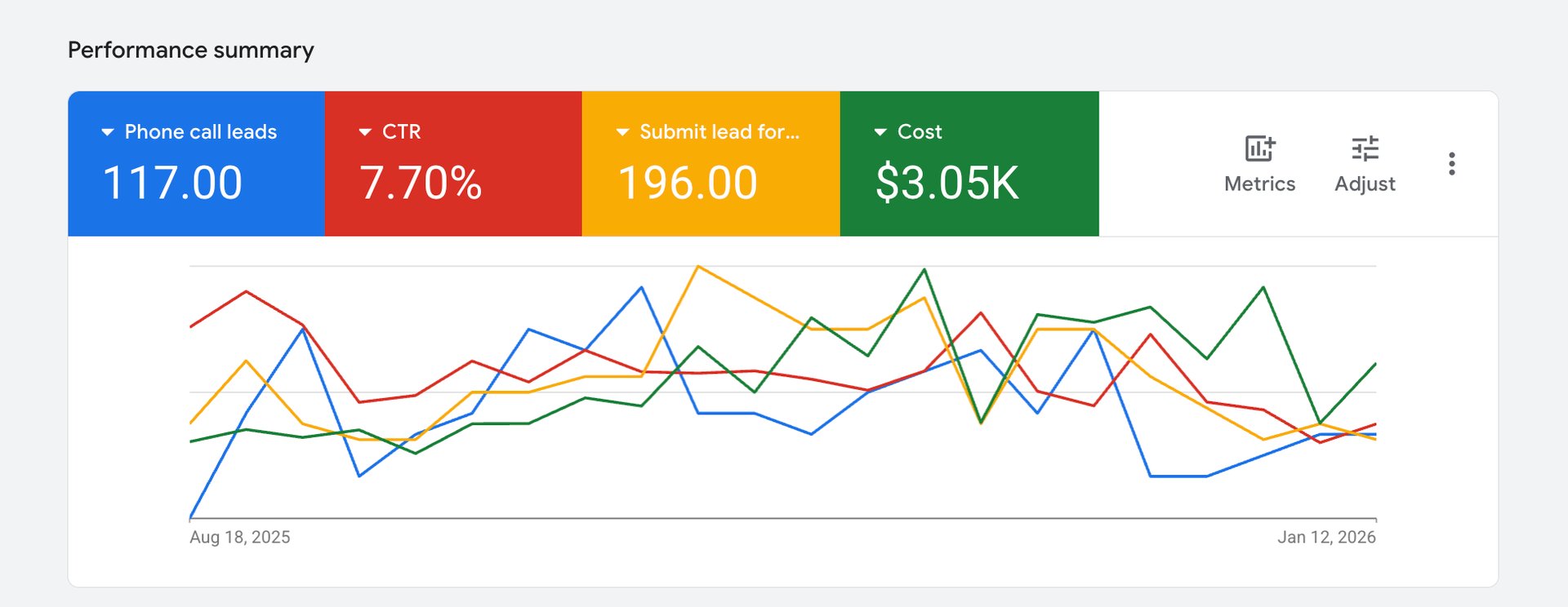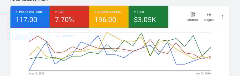 I built a Google Ads acquisition system from scratch, focused on real business outcomes. The system was designed to generate phone calls, online booking submissions, and bookings directly from the ads.
